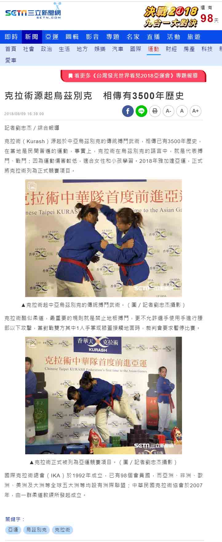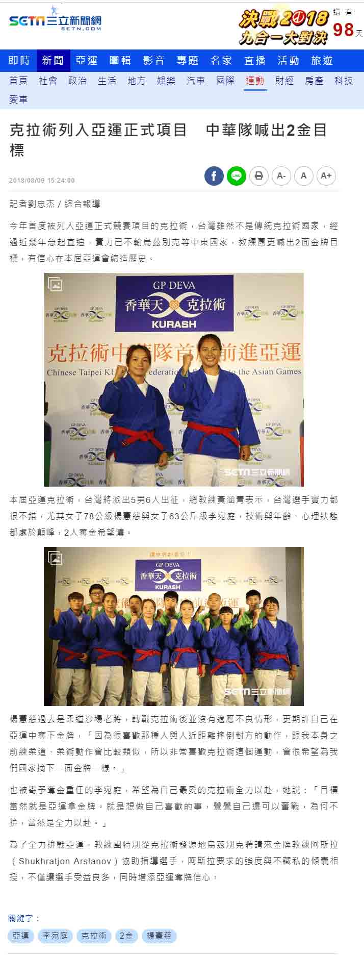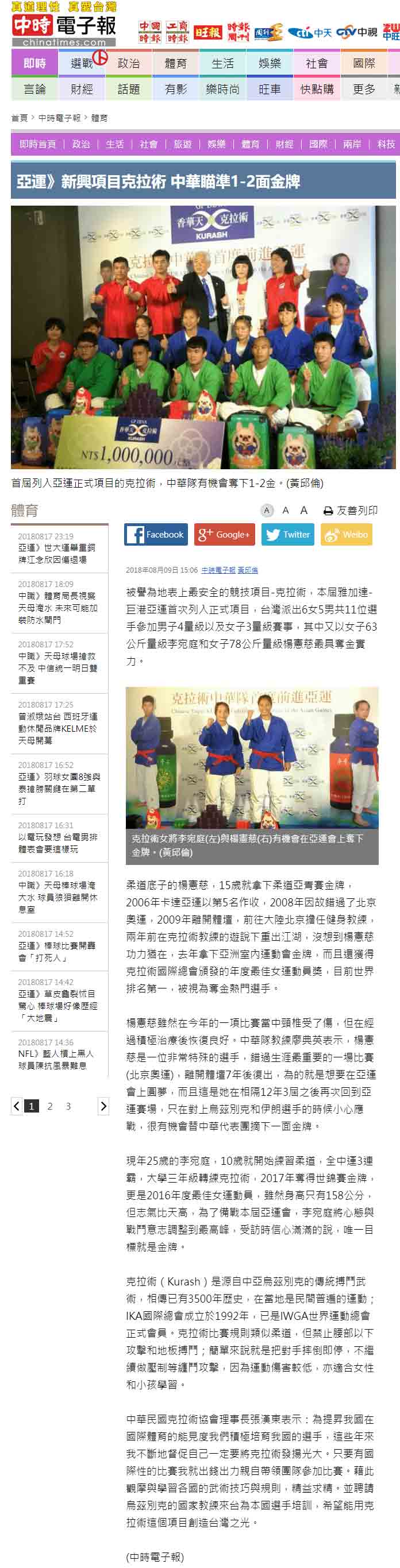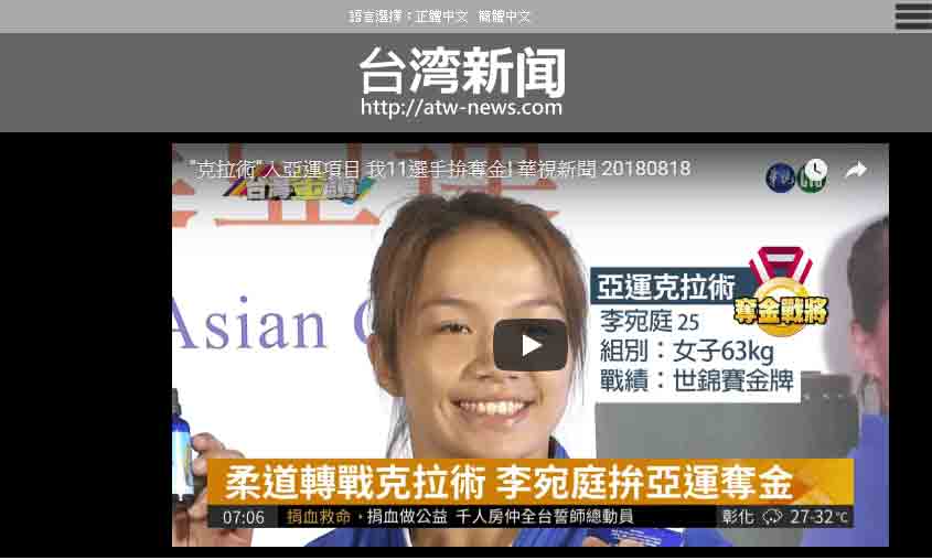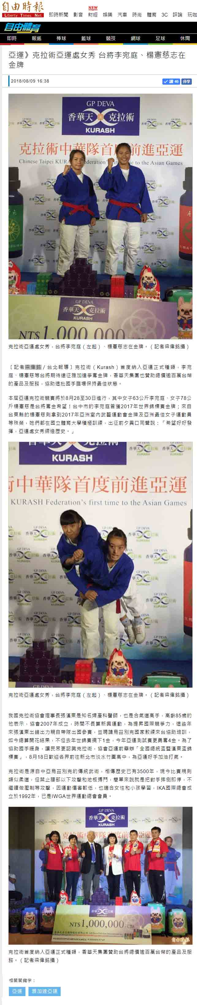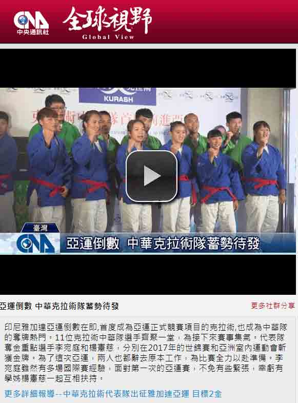 媒体:中华广角镜报 日期:2018/8/9 标题:为克拉术选手加油! 香华天赞助克拉术选手前进亚运 媒体:中时电子报 日期:2018/8/9 标题:亚运》新兴项目克拉术 中华瞄准1-2面金牌 媒体:Match生活网 日期:2018/8/9 标题:亚运》新兴项目克拉术 中华瞄准1-2面金牌 媒体:青年日报 日期:2018/8/9 标题:克拉术首列亚运赛事 中华队有望夺金 媒体:中央广播电台新闻网 日期:2018/8/9 标题:印尼亚运/克拉术首列正式项目 我瞄准2金 媒体:PChome 新闻 日期:2018/8/9 标题:印尼亚运/克拉术首列正式项目 我瞄准2金 媒体:Yahoo 奇摩新闻 日期:2018/8/9 标题:印尼亚运/克拉术首列正式项目 我瞄准2金 媒体:China News 日期:2018/8/9 标题:印尼亚运/克拉术首列正式项目 我瞄准2金 媒体:三立新闻网 日期:2018/8/9 标题:克拉术源起乌兹别克 相传有3500年历史 媒体:三立新闻网 日期:2018/8/9 标题:克拉术列入亚运正式项目 中华队喊出2金目标 媒体:Yahoo 奇摩新闻 日期:2018/8/9 标题:克拉术正式被列入亚运竞技术目 媒体:Yahoo 奇摩运动 日期:2018/8/9 标题:亚运新增克拉术 中华队目标2金 媒体:MSN 运动 日期:2018/8/9 标题:亚运新增克拉术 中华队目标2金 标题:Yahoo 奇摩新闻 日期:2018/8/9 标题:亚运新增克拉术 中华队目标2金 媒体:CMoney 追讯 日期:2018/8/9 标题:亚运新增克拉术 中华队目标2金 sina 新浪新闻 日期:2018/8/9 标题:雅加达亚运新增克拉术 中华队目标抢金 媒体:Yahoo 奇摩新闻 日期:2018/8/9 标题:雅加达亚运新增克拉术 中华队目标抢金