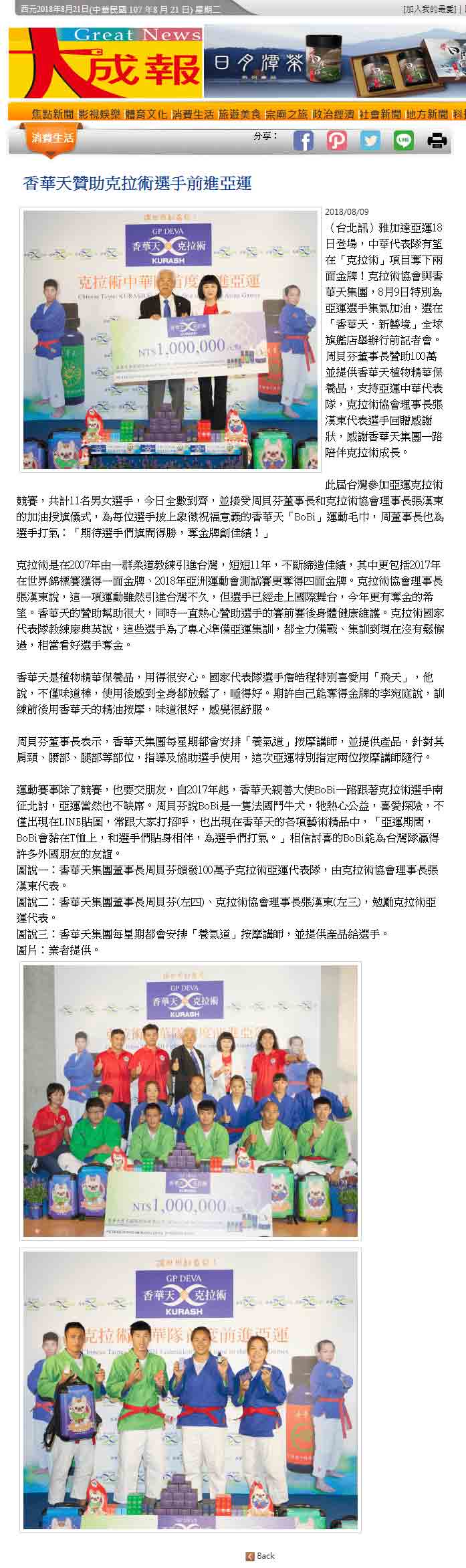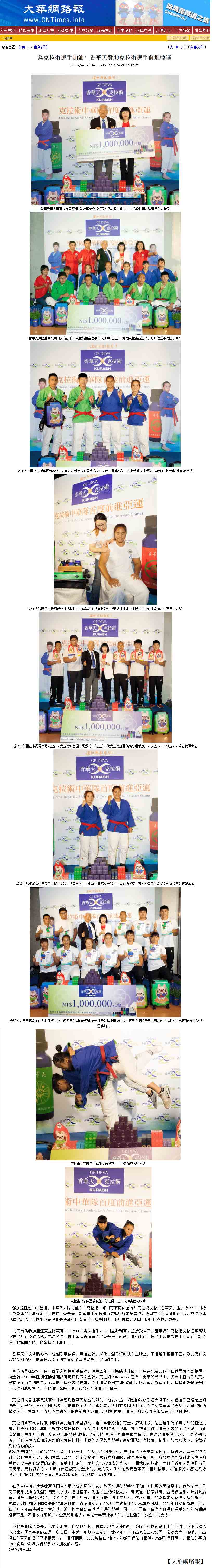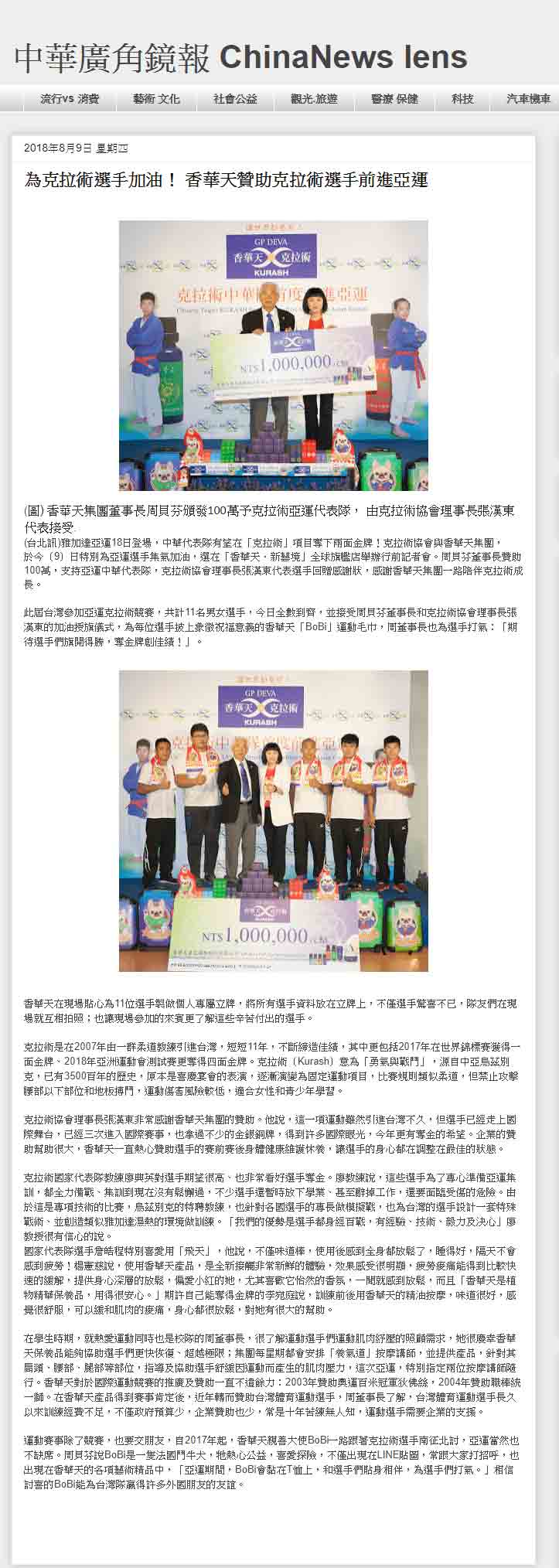 感谢 NowNews、壹周刊、镜传媒、工商时报、爽报、台湾新闻报、上报、梦想志、劲报、大成报、大华网路报、中央社全球视野、经济日报、今日报、丽台运动报、ETtoday新闻云、中央社、苹果日报、联合新闻网、自由时报、Soonnet等多家媒体报导。 媒体:Nownews 日期:2018/8/13 标题:香华天集团赞助克拉术选手 前进亚运 媒体:壹周刊 日期:2018/8/10 标题:香华天赞助克拉术选手 前进亚运 媒体:镜传媒 日期:2018/8/10 标题:香华天赞助克拉术选手 前进亚运 媒体:工商时报 日期:2018/8/10 标题:雅加达亚运8月18日登场 香华天赞助克拉术选手 媒体:爽报 日期:2018/8/10 标题:香华天赞助克拉术选手 前进亚运 媒体:台湾新闻报 日期:2018/8/9 标题:克拉术选手首征亚运 香华天赞助相挺 媒体:上报 日期:2018/8/9 标题:克拉术选手首征亚运 香华天赞助相挺 媒体:梦想志 日期:2018/8/10 标题:【香华天】赞助选手前进亚运 齐心为克拉术选手加油 媒体:劲报 日期:2018/8/9 标题:克拉术选手首征亚运 香华天赞助相挺 媒体:大成报 日期:2018/8/9 标题:香华天赞助克拉术选手 前进亚运 媒体:大华网路报 日期:2018/8/9 标题:为克拉术选手加油!香华天赞助克拉术选手前进亚运 媒体:中央社全球视野 日期:2018/8/9 标题:亚运倒数 中华克拉术队蓄势待发 媒体:经济日报 日期:2018/8/9 标题:香华天集团赞助克拉术选手 前进亚运 媒体:今日报 日期:2018/8/9 标题:香华天赞助克拉术选手 前进亚运夺金 媒体:丽台运动报 日期:2018/8/9 标题:亚运》中华克拉术代表队成军 2女将目标亚运历史首金 媒体:ETtoday新闻云 日期:2018/8/9 标题:亚运克拉术/中亚古武术首进亚运 中华队目标2金 媒体:中央社 日期:2018/8/9 标题:中华克拉术代表队出征雅加达亚运 目标2金 媒体: WOWSight 日期:2018/8/9 标题:《亚运》乌兹别克古老武术成为正式竞赛 中华克拉术队目标2金 媒体:苹果日报 日期:2018/8/9 标题:克拉术首入亚运 2女金目标争金18日淡水以赛暖身 媒体:联合新闻网 日期:2018/8/9 标题:亚运/克拉术首度出击 金牌是唯一目标 媒体:联合新闻网 日期:2018/8/9 标题:影/克拉术前进2018亚运 夺牌希望大 媒体:自由时报 日期:2018/8/9 标题:亚运》克拉术亚运处女秀 台将李宛庭、杨宪慈志在金牌 媒体:Soonnet 日期:2018/8/9 (影片)克拉术首列亚运正式项目 中华队拚金牌