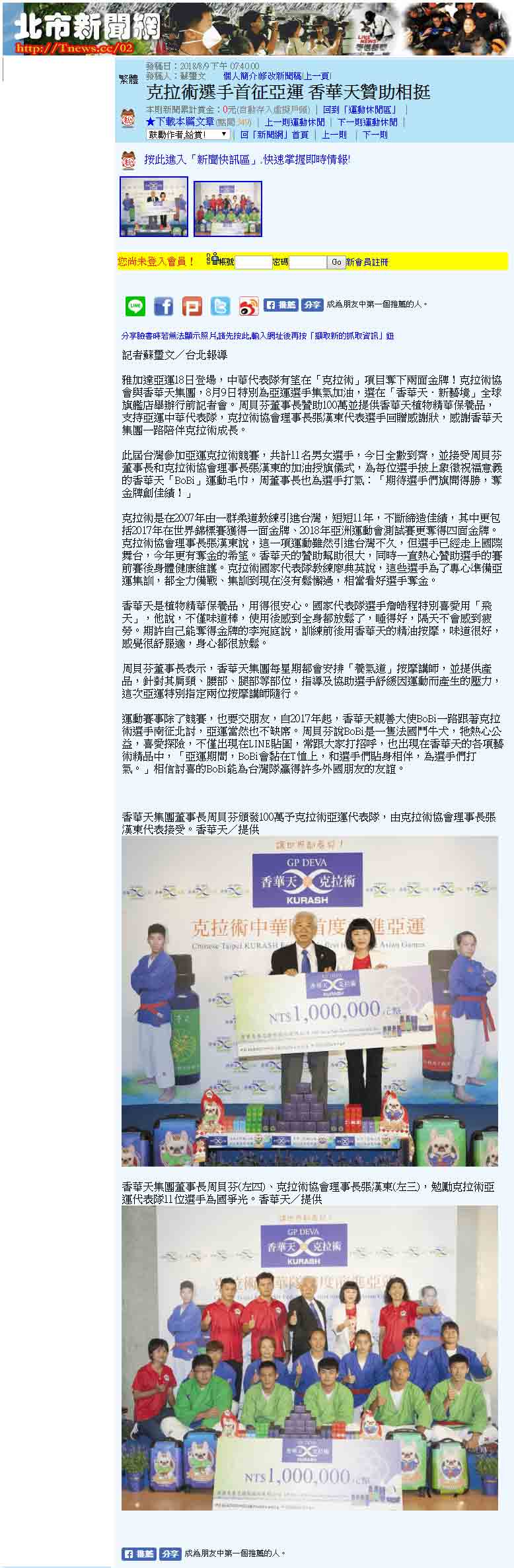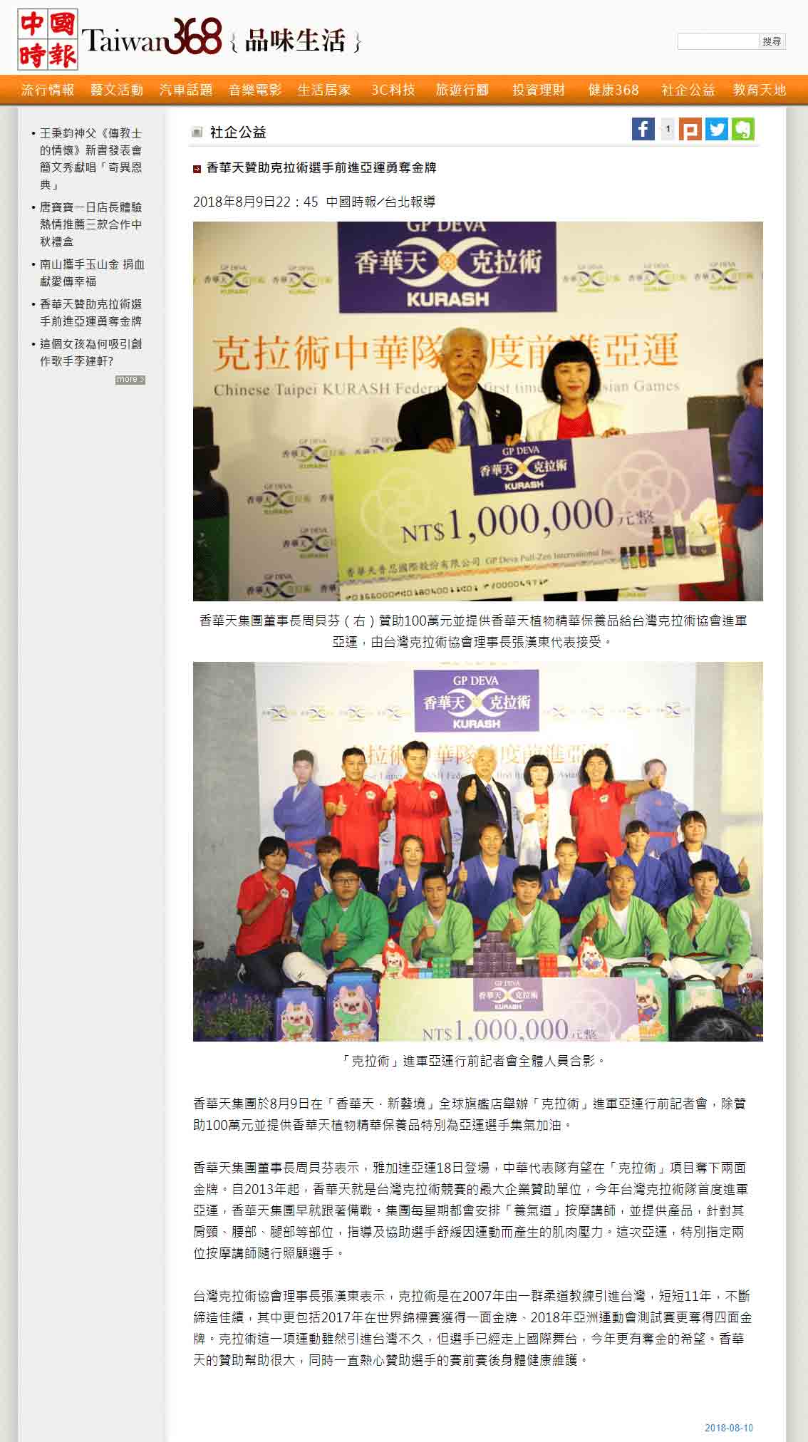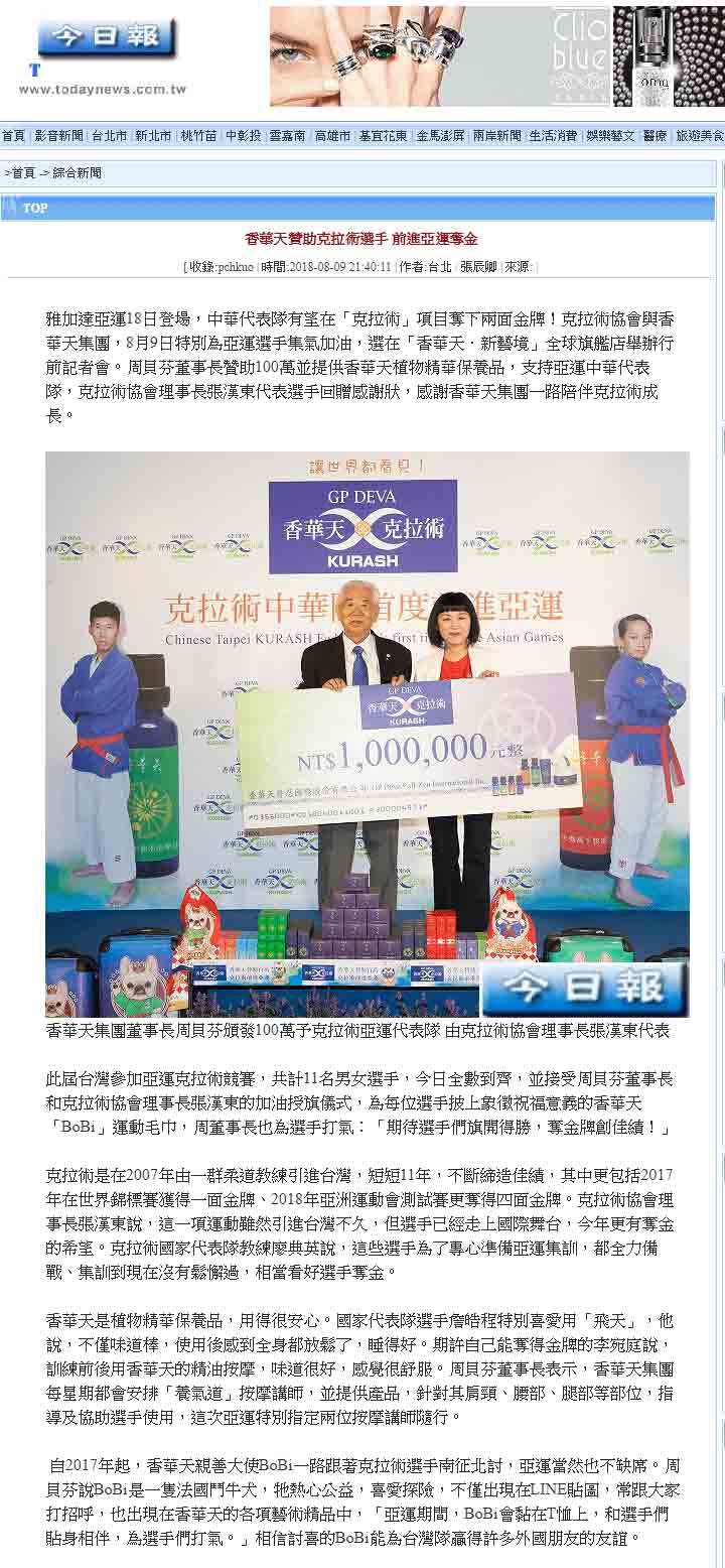 感谢 NowNews、壹周刊、镜传媒、工商时报、爽报、台湾新闻报、上报、梦想志、劲报、大成报、大华网路报、中央社全球视野、经济日报、今日报、丽台运动报、ETtoday新闻云、中央社、苹果日报、联合新闻网、自由时报、Soonnet等多家媒体报导。 媒体:Nownews 日期:2018/8/13 标题:香华天集团赞助克拉术选手 前进亚运 媒体:壹周刊 日期:2018/8/10 标题:香华天赞助克拉术选手 前进亚运 媒体:镜传媒 日期:2018/8/10 标题:香华天赞助克拉术选手 前进亚运 媒体:工商时报 日期:2018/8/10 标题:雅加达亚运8月18日登场 香华天赞助克拉术选手 媒体:爽报 日期:2018/8/10 标题:香华天赞助克拉术选手 前进亚运 媒体:台湾新闻报 日期:2018/8/9 标题:克拉术选手首征亚运 香华天赞助相挺 媒体:上报 日期:2018/8/9 标题:克拉术选手首征亚运 香华天赞助相挺 媒体:梦想志 日期:2018/8/10 标题:【香华天】赞助选手前进亚运 齐心为克拉术选手加油 媒体:劲报 日期:2018/8/9 标题:克拉术选手首征亚运 香华天赞助相挺 媒体:大成报 日期:2018/8/9 标题:香华天赞助克拉术选手 前进亚运 媒体:大华网路报 日期:2018/8/9 标题:为克拉术选手加油!香华天赞助克拉术选手前进亚运 媒体:中央社全球视野 日期:2018/8/9 标题:亚运倒数 中华克拉术队蓄势待发 媒体:经济日报 日期:2018/8/9 标题:香华天集团赞助克拉术选手 前进亚运 媒体:今日报 日期:2018/8/9 标题:香华天赞助克拉术选手 前进亚运夺金 媒体:丽台运动报 日期:2018/8/9 标题:亚运》中华克拉术代表队成军 2女将目标亚运历史首金 媒体:ETtoday新闻云 日期:2018/8/9 标题:亚运克拉术/中亚古武术首进亚运 中华队目标2金 媒体:中央社 日期:2018/8/9 标题:中华克拉术代表队出征雅加达亚运 目标2金 媒体: WOWSight 日期:2018/8/9 标题:《亚运》乌兹别克古老武术成为正式竞赛 中华克拉术队目标2金 媒体:苹果日报 日期:2018/8/9 标题:克拉术首入亚运 2女金目标争金18日淡水以赛暖身 媒体:联合新闻网 日期:2018/8/9 标题:亚运/克拉术首度出击 金牌是唯一目标 媒体:联合新闻网 日期:2018/8/9 标题:影/克拉术前进2018亚运 夺牌希望大 媒体:自由时报 日期:2018/8/9 标题:亚运》克拉术亚运处女秀 台将李宛庭、杨宪慈志在金牌 媒体:Soonnet 日期:2018/8/9 (影片)克拉术首列亚运正式项目 中华队拚金牌