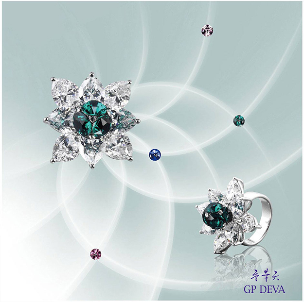「大运波罗花」,有项鍊和戒指的款式,宝石颜色多样,能配戴出贵气,亦或呈现活泼的多元搭配。