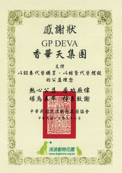 CEO Rose of Dog Home of stray animals (left) presented a Certificate of Appreciation; Vice President Emerald Lin received the certificate on behalf of GP DEVA.