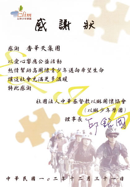 CEO Qiu Ming Kuo of "Elim Youth Academy" presented a Certificate of Appreciation; Vice President Emerald Lin received the certificate on behalf of GP DEVA.