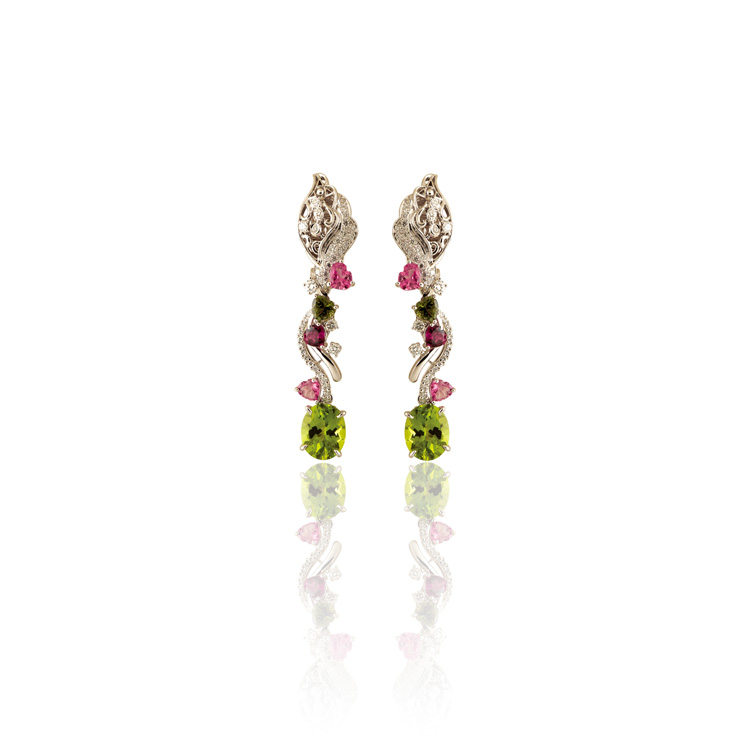 “Angel Garden” crafted using various colorful gems represents a blooming garden under the sun. The chain is formed by interlacing angel wing patterns. This piece takes 6 months to create from selecting right gemstones, matching the colors and to carving and polishing. Every gem is unique, therefore, only one single piece was made, worthy to be part of the Master Series.