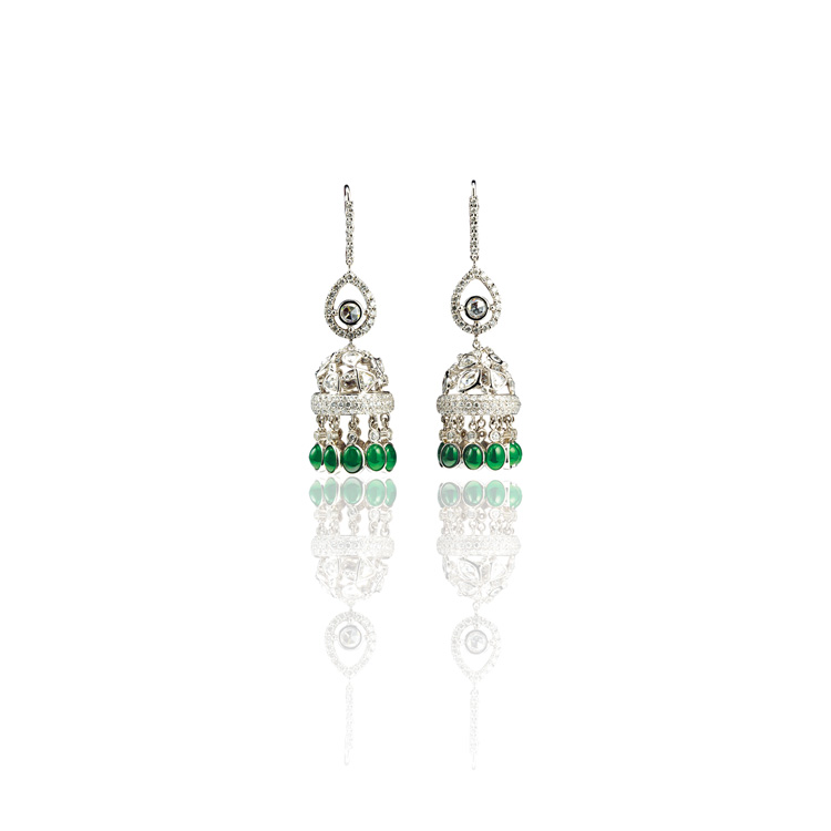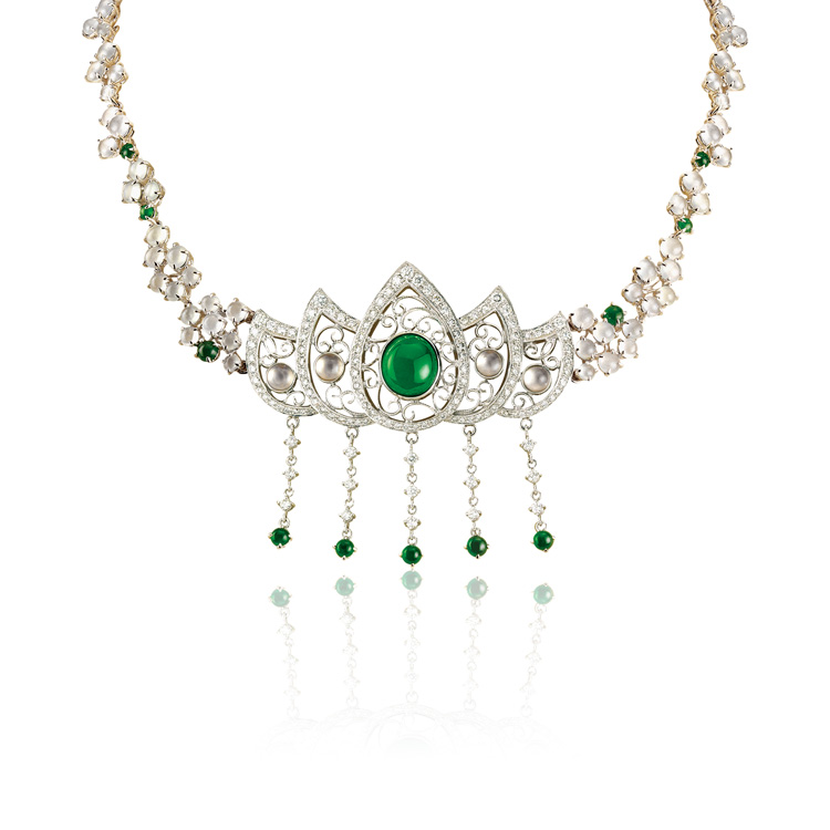 Five gemstones adorned on five lotus petals symbolize “perfect ten,” a perfect score. The emerald inlaid in the center becomes slightly translucent when it catches light. Over a hundred premium jades with similar sizes were meticulously hand placed onto the piece one by one. A rare piece with finest craftsmanship fits for a royal!