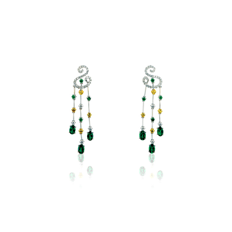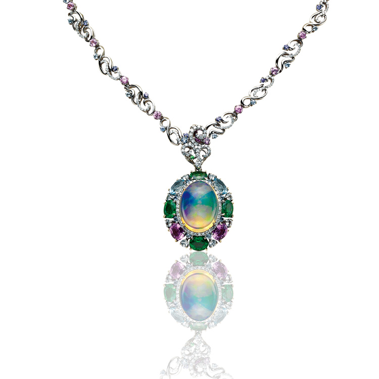 The center fire opal is translucent, emits colorful rays and is embellished with tsavorite and aquamarines around. The 18K gold necklace chain is dazzled with diamonds and purple corundum in interlacing curved design. Paired with matching earring set destined to steal the spotlight!
