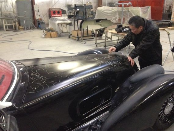 Master Lee Sun-Don foundation sketch on the hood of the DiMora Vicci 6.2. DiMora Motorcar then creates the final painting from his drawing. At Sir Alfred DiMora’s first meeting with the artist, Master Sun-Don jumped up on top of the Vicci 6.2 and sketched spontaneously on the hood. Photograph courtesy of GP Deva.