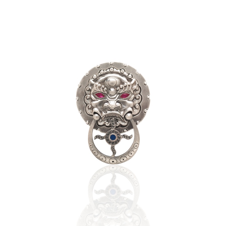 「體大華嚴 II」銀飾,設計靈感來自創意總監李善單教授的「大將門」系列作品。立體浮雕獅頭門環造型,複刻保有東方美學,應用於墜飾和別針兩用。 「大將門」系列,是李善單教授從各地蒐羅中國骨董級獅門銅環,作為當代藝術創作的媒材,以現代航空用漆重新詮釋創作,呈現一系列氣勢磅礡的作品。