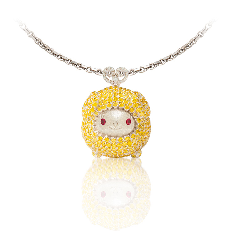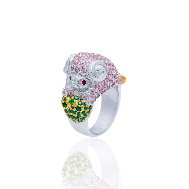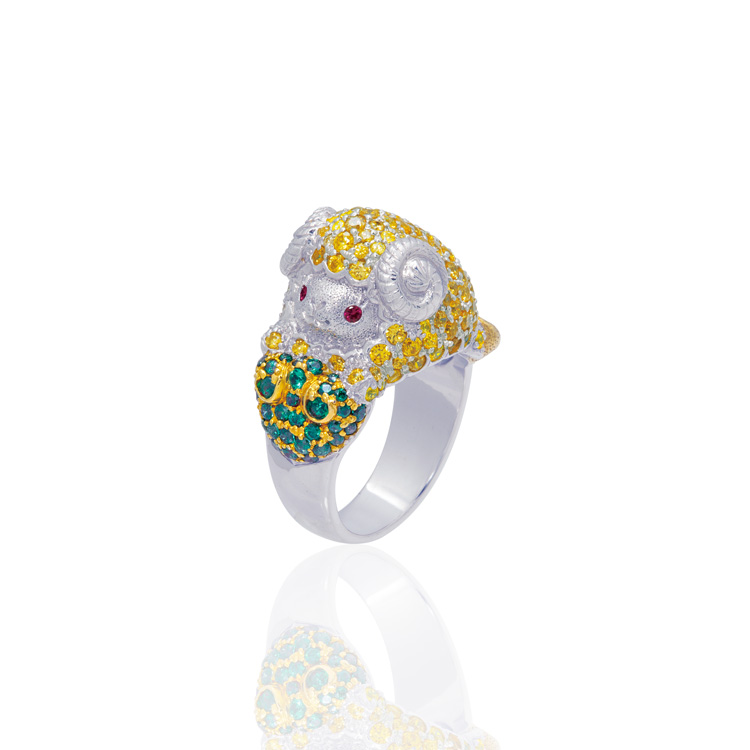 「揚眉吐氣 大發財」生肖珠寶,圓滾滾造型的羊年珠寶,鑲滿華麗小鑽,有嫩黃、粉紫及亮色三系列,可愛、討喜又富時尚感,象徵諸事圓滿、財源滾滾來!