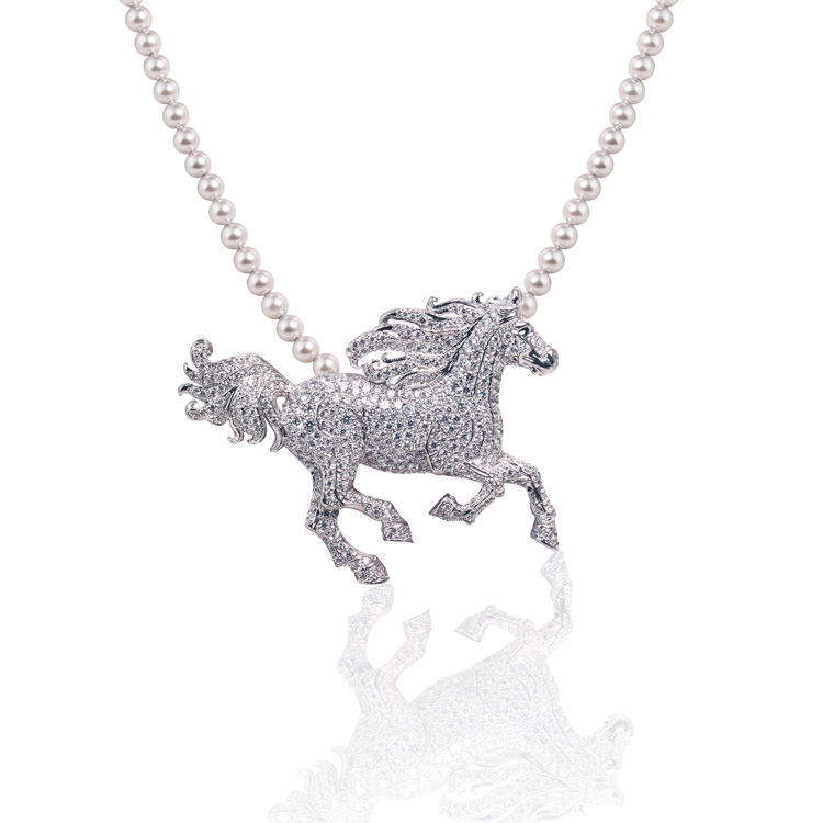 「天馬化祿」,以400顆CZ美鑽,鑲製出充滿昂揚活力的駿馬,祝福大家在新的一年飛馬呈祥、好運財運馬上到! 寶勝畫廊代理畫家童勝和的作品,依據畫作轉換成珠寶設計,有滿鑽及炫彩。 天馬化祿滿鑽作品是由400顆小鑽華麗的駿馬,勾劃出奔跑活力,利用鑲工生動的呈現肌肉線條動力,讓2014馬力全開,魅力四射。 天馬化祿炫彩款,翅膀及雲的位置是用獨特的手工炫色處理方式,令師父費時費工,鬃毛及馬尾共鑲117顆小鑽,讓馬匹頓時閃亮飄逸起來,栩栩如生、讓人目不轉睛。