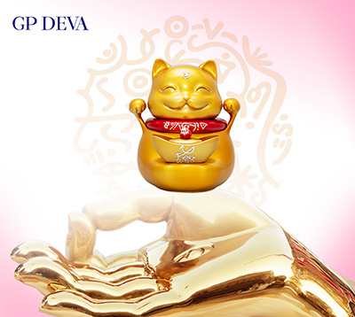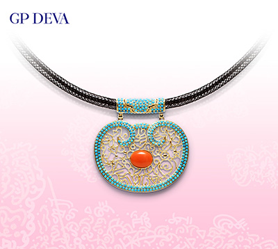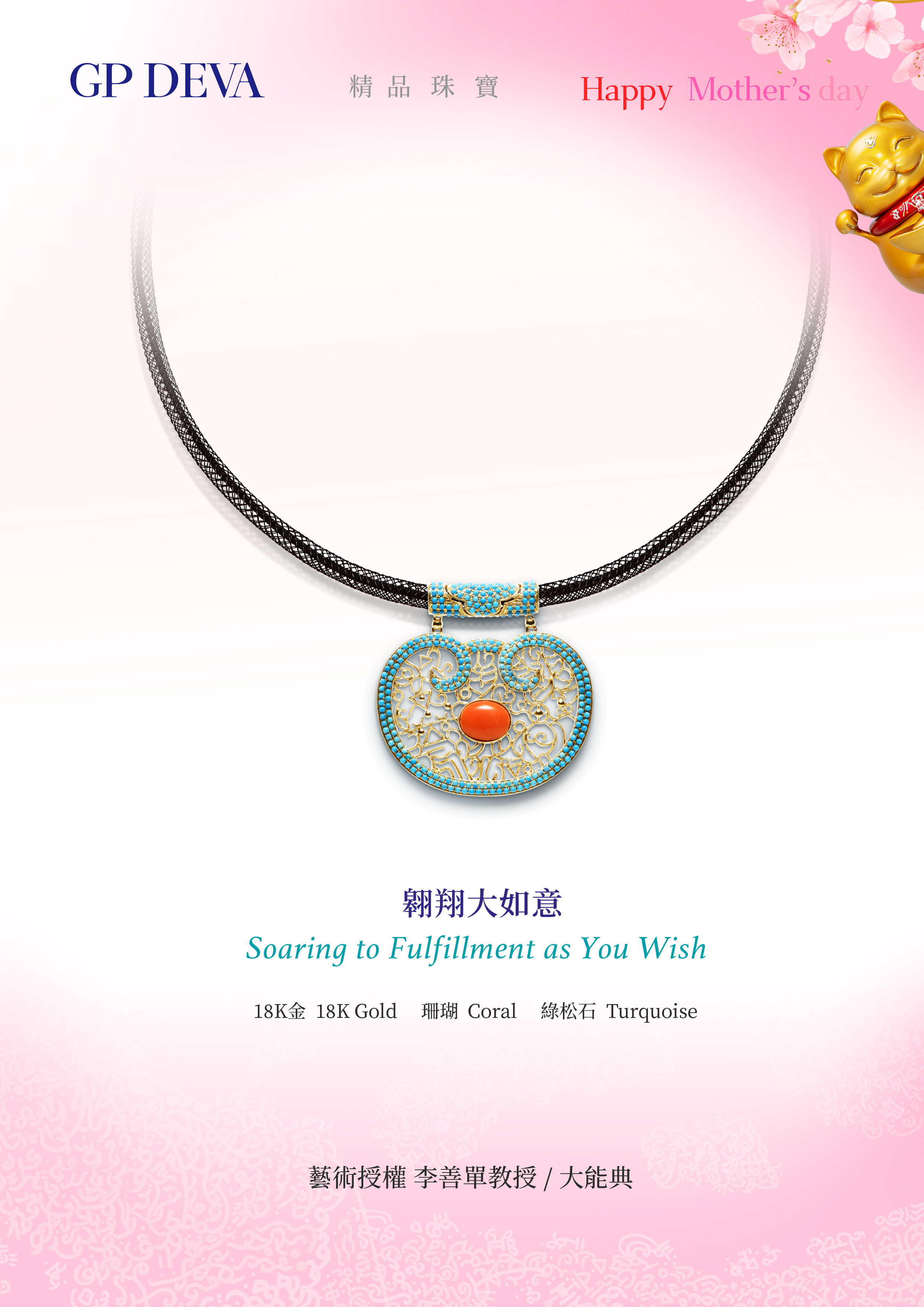 選用海洋上的寶石-紅珊瑚為主石,採18k 金一神滾珠拉線作法勾勒出「大能典」藝術圖騰,綠松石鑲嵌點綴於如意外框,顯現珠寶的精湛工藝。