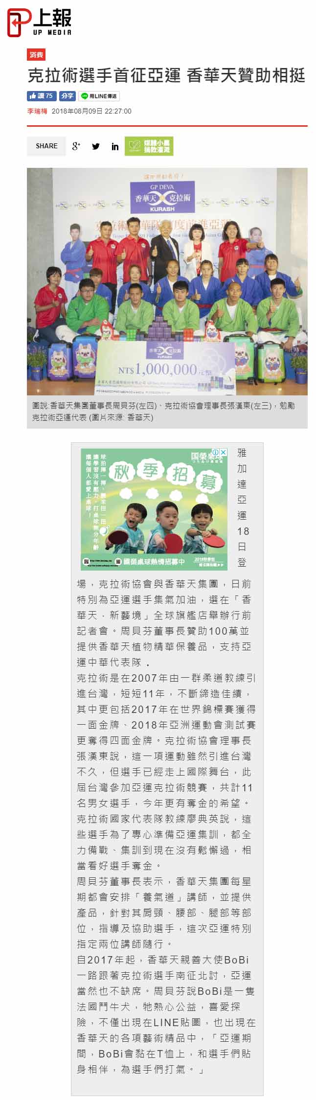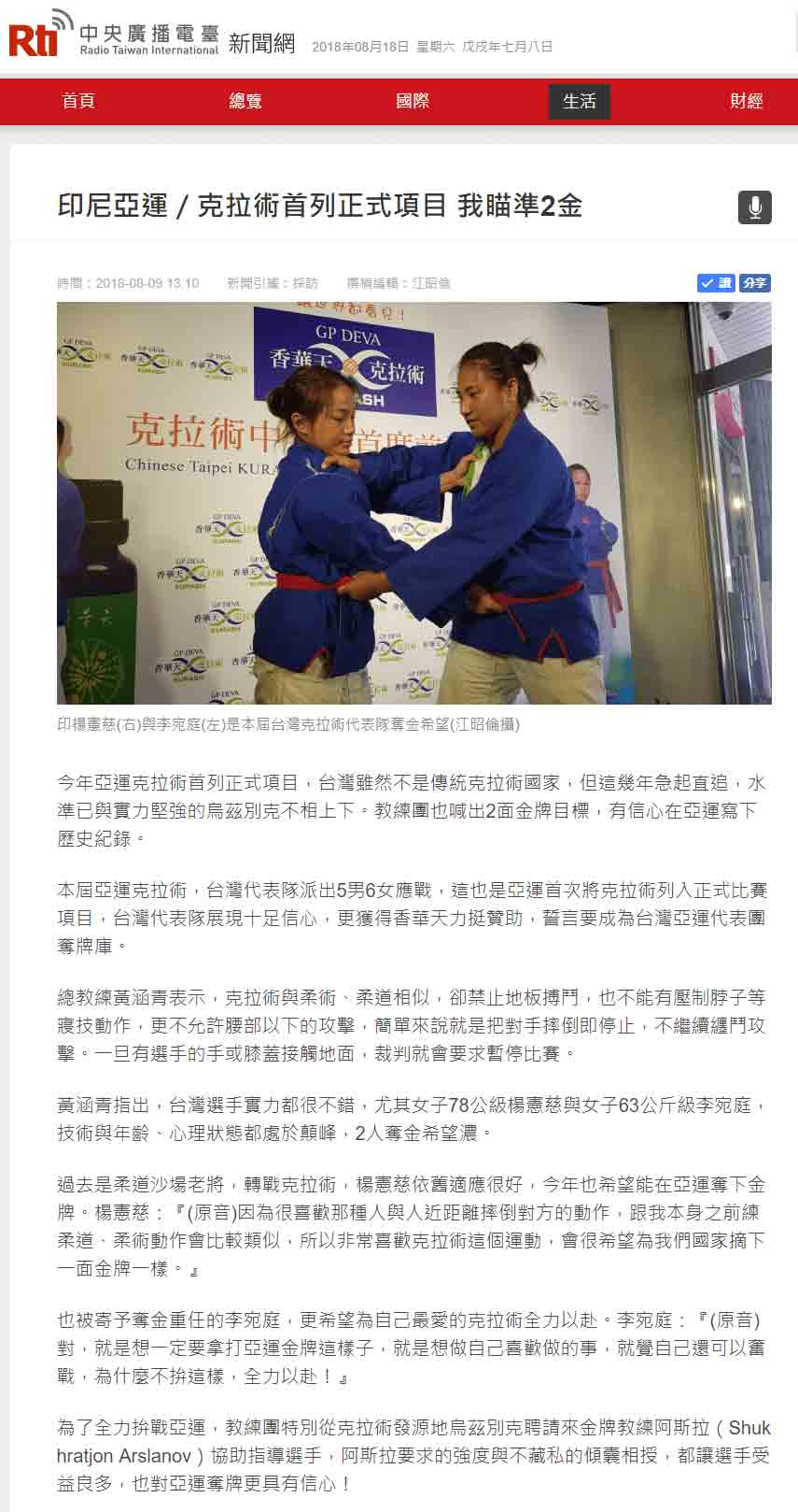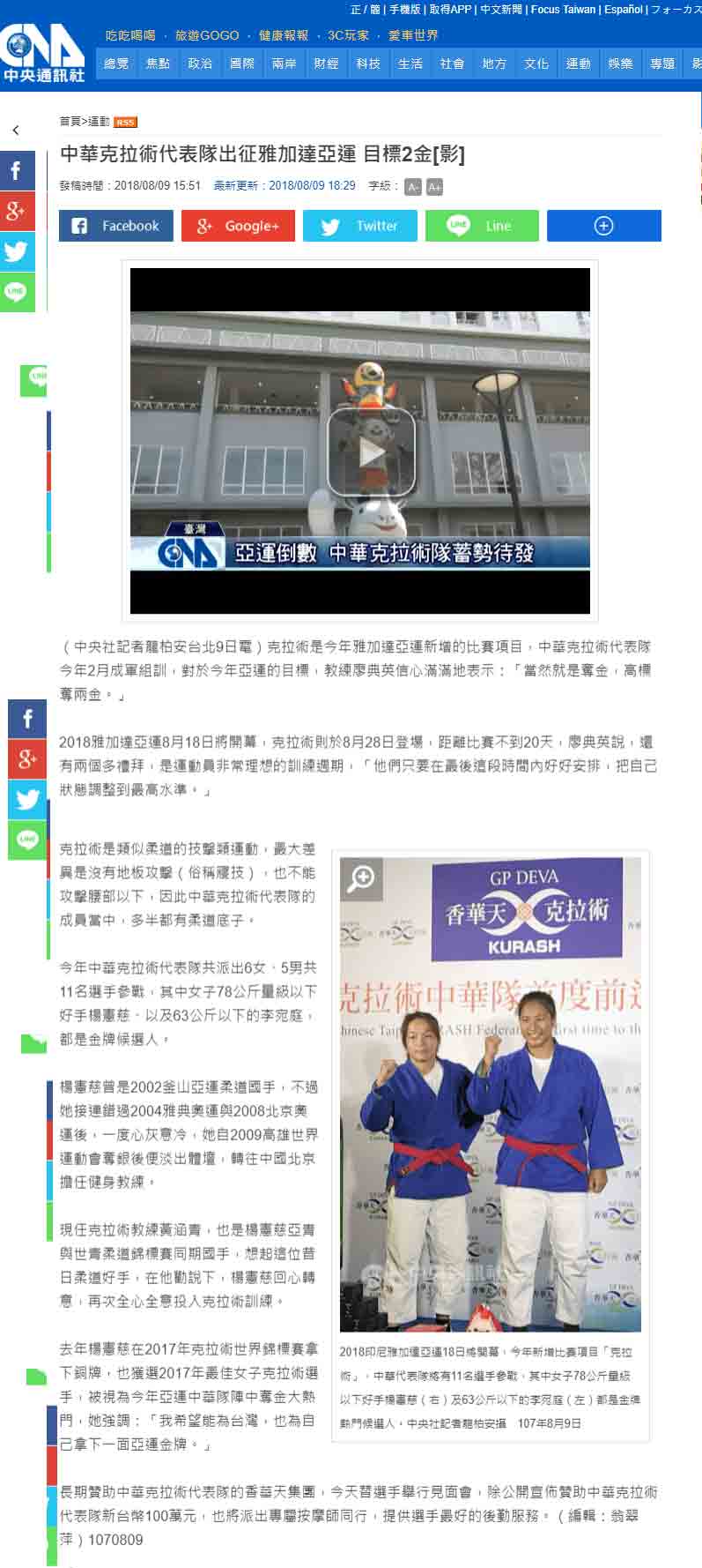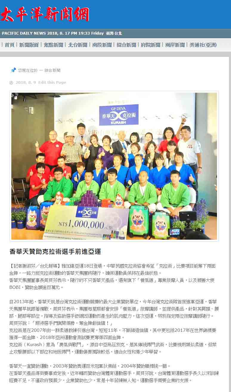 媒体:中华广角镜报 日期:2018/8/9 标题:为克拉术选手加油! 香华天赞助克拉术选手前进亚运 媒体:中时电子报 日期:2018/8/9 标题:亚运》新兴项目克拉术 中华瞄准1-2面金牌 媒体:Match生活网 日期:2018/8/9 标题:亚运》新兴项目克拉术 中华瞄准1-2面金牌 媒体:青年日报 日期:2018/8/9 标题:克拉术首列亚运赛事 中华队有望夺金 媒体:中央广播电台新闻网 日期:2018/8/9 标题:印尼亚运/克拉术首列正式项目 我瞄准2金 媒体:PChome 新闻 日期:2018/8/9 标题:印尼亚运/克拉术首列正式项目 我瞄准2金 媒体:Yahoo 奇摩新闻 日期:2018/8/9 标题:印尼亚运/克拉术首列正式项目 我瞄准2金 媒体:China News 日期:2018/8/9 标题:印尼亚运/克拉术首列正式项目 我瞄准2金 媒体:三立新闻网 日期:2018/8/9 标题:克拉术源起乌兹别克 相传有3500年历史 媒体:三立新闻网 日期:2018/8/9 标题:克拉术列入亚运正式项目 中华队喊出2金目标 媒体:Yahoo 奇摩新闻 日期:2018/8/9 标题:克拉术正式被列入亚运竞技术目 媒体:Yahoo 奇摩运动 日期:2018/8/9 标题:亚运新增克拉术 中华队目标2金 媒体:MSN 运动 日期:2018/8/9 标题:亚运新增克拉术 中华队目标2金 标题:Yahoo 奇摩新闻 日期:2018/8/9 标题:亚运新增克拉术 中华队目标2金 媒体:CMoney 追讯 日期:2018/8/9 标题:亚运新增克拉术 中华队目标2金 sina 新浪新闻 日期:2018/8/9 标题:雅加达亚运新增克拉术 中华队目标抢金 媒体:Yahoo 奇摩新闻 日期:2018/8/9 标题:雅加达亚运新增克拉术 中华队目标抢金