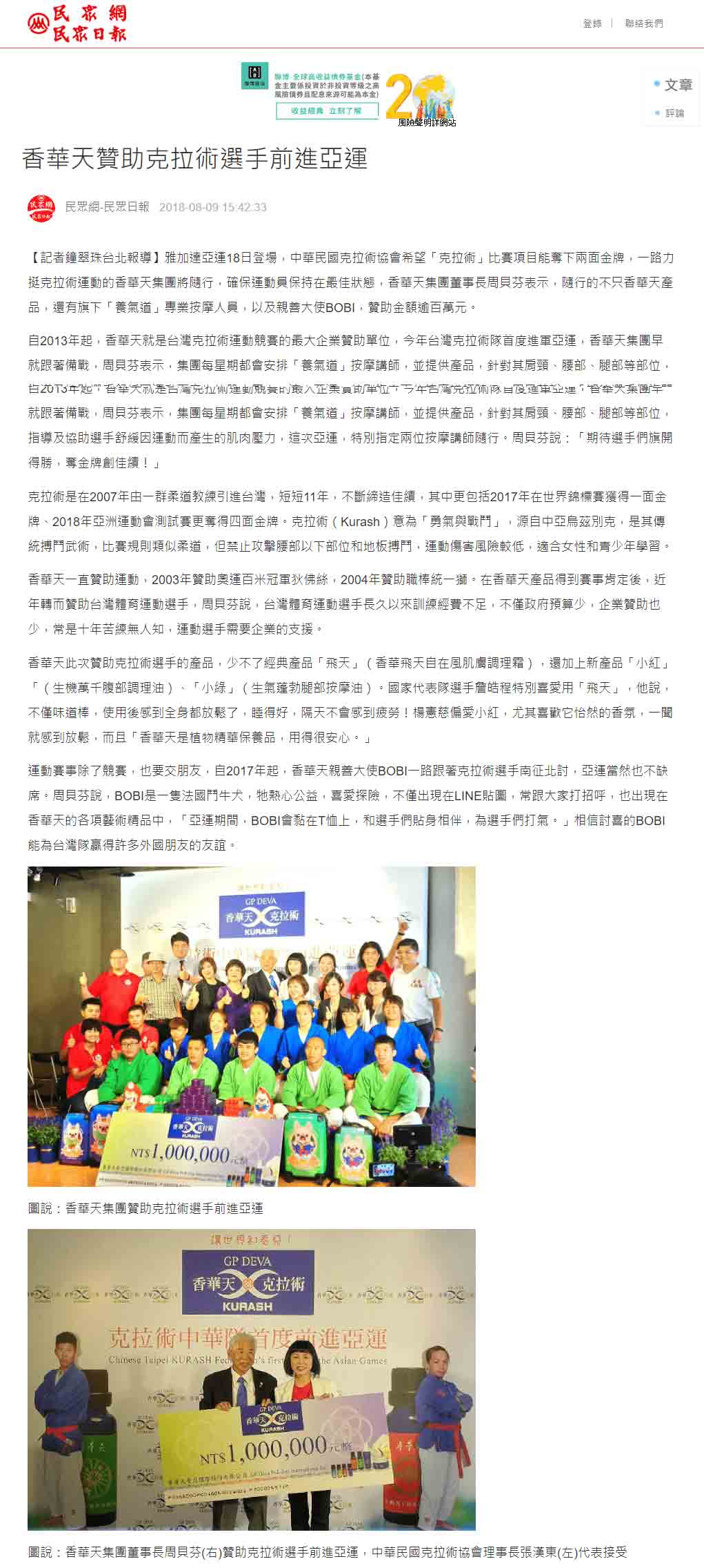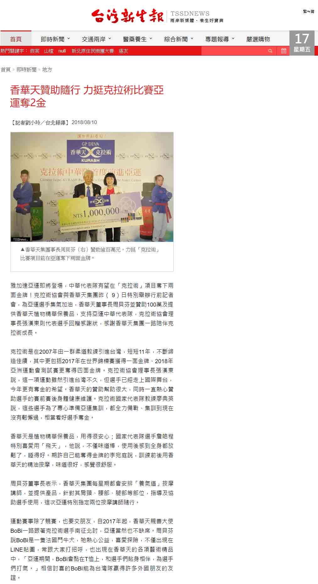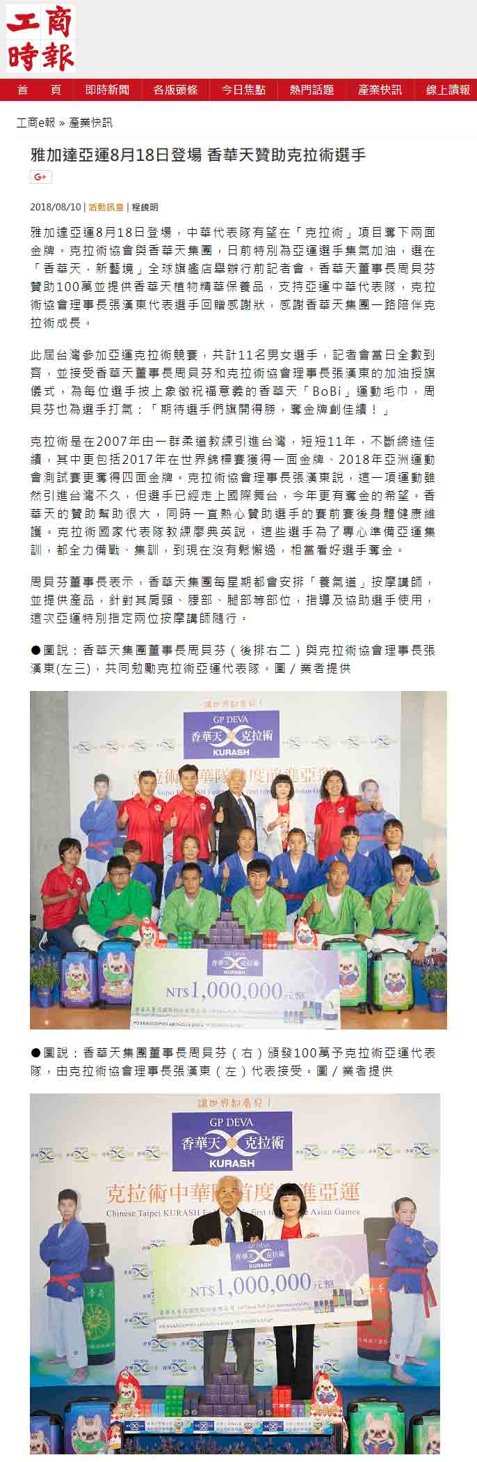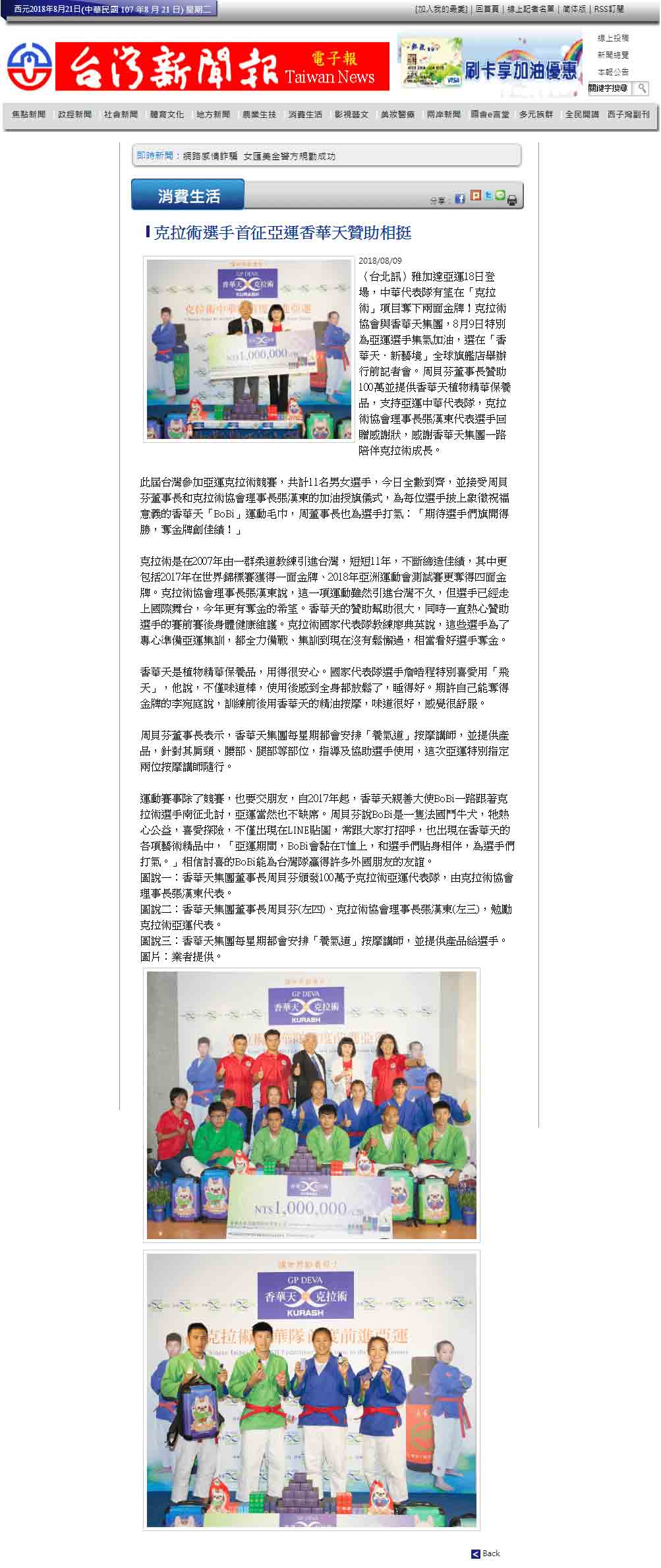 感谢 NowNews、壹周刊、镜传媒、工商时报、爽报、台湾新闻报、上报、梦想志、劲报、大成报、大华网路报、中央社全球视野、经济日报、今日报、丽台运动报、ETtoday新闻云、中央社、苹果日报、联合新闻网、自由时报、Soonnet等多家媒体报导。 媒体:Nownews 日期:2018/8/13 标题:香华天集团赞助克拉术选手 前进亚运 媒体:壹周刊 日期:2018/8/10 标题:香华天赞助克拉术选手 前进亚运 媒体:镜传媒 日期:2018/8/10 标题:香华天赞助克拉术选手 前进亚运 媒体:工商时报 日期:2018/8/10 标题:雅加达亚运8月18日登场 香华天赞助克拉术选手 媒体:爽报 日期:2018/8/10 标题:香华天赞助克拉术选手 前进亚运 媒体:台湾新闻报 日期:2018/8/9 标题:克拉术选手首征亚运 香华天赞助相挺 媒体:上报 日期:2018/8/9 标题:克拉术选手首征亚运 香华天赞助相挺 媒体:梦想志 日期:2018/8/10 标题:【香华天】赞助选手前进亚运 齐心为克拉术选手加油 媒体:劲报 日期:2018/8/9 标题:克拉术选手首征亚运 香华天赞助相挺 媒体:大成报 日期:2018/8/9 标题:香华天赞助克拉术选手 前进亚运 媒体:大华网路报 日期:2018/8/9 标题:为克拉术选手加油!香华天赞助克拉术选手前进亚运 媒体:中央社全球视野 日期:2018/8/9 标题:亚运倒数 中华克拉术队蓄势待发 媒体:经济日报 日期:2018/8/9 标题:香华天集团赞助克拉术选手 前进亚运 媒体:今日报 日期:2018/8/9 标题:香华天赞助克拉术选手 前进亚运夺金 媒体:丽台运动报 日期:2018/8/9 标题:亚运》中华克拉术代表队成军 2女将目标亚运历史首金 媒体:ETtoday新闻云 日期:2018/8/9 标题:亚运克拉术/中亚古武术首进亚运 中华队目标2金 媒体:中央社 日期:2018/8/9 标题:中华克拉术代表队出征雅加达亚运 目标2金 媒体: WOWSight 日期:2018/8/9 标题:《亚运》乌兹别克古老武术成为正式竞赛 中华克拉术队目标2金 媒体:苹果日报 日期:2018/8/9 标题:克拉术首入亚运 2女金目标争金18日淡水以赛暖身 媒体:联合新闻网 日期:2018/8/9 标题:亚运/克拉术首度出击 金牌是唯一目标 媒体:联合新闻网 日期:2018/8/9 标题:影/克拉术前进2018亚运 夺牌希望大 媒体:自由时报 日期:2018/8/9 标题:亚运》克拉术亚运处女秀 台将李宛庭、杨宪慈志在金牌 媒体:Soonnet 日期:2018/8/9 (影片)克拉术首列亚运正式项目 中华队拚金牌