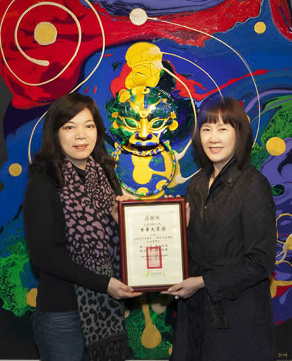 CEO Rose of Dog Home of stray animals (left) presented a Certificate of Appreciation; Vice President Emerald Lin received the certificate on behalf of GP DEVA.