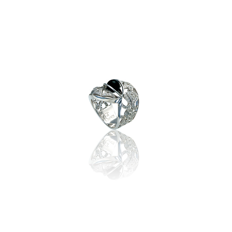The mystical beauty of agate surrounded by diamonds in sophisticated pavé setting depicts the dazzling light and purity in the “Eye of Angel,” symbolizing the lifelong protection and care. The reverse back side formed by elegant hollow lines demonstrate the beauty of simplicity. This piece can be worn on both facets for different occasions.