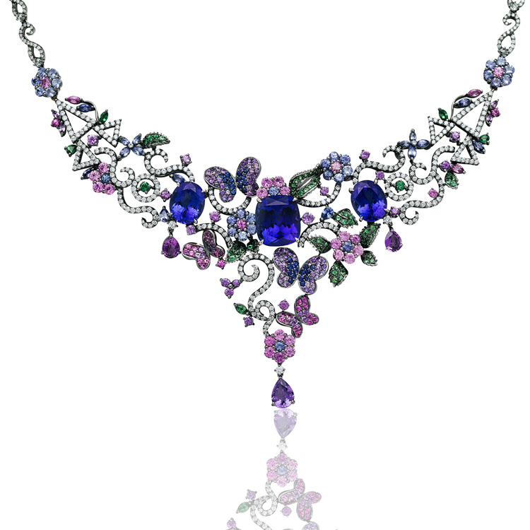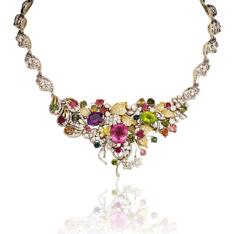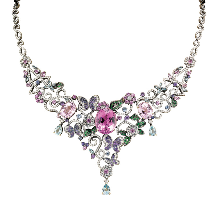 “Angel Garden” crafted using various colorful gems represents a blooming garden under the sun. The chain is formed by interlacing angel wing patterns. This piece takes 6 months to create from selecting right gemstones, matching the colors and to carving and polishing. Every gem is unique, therefore, only one single piece was made, worthy to be part of the Master Series.