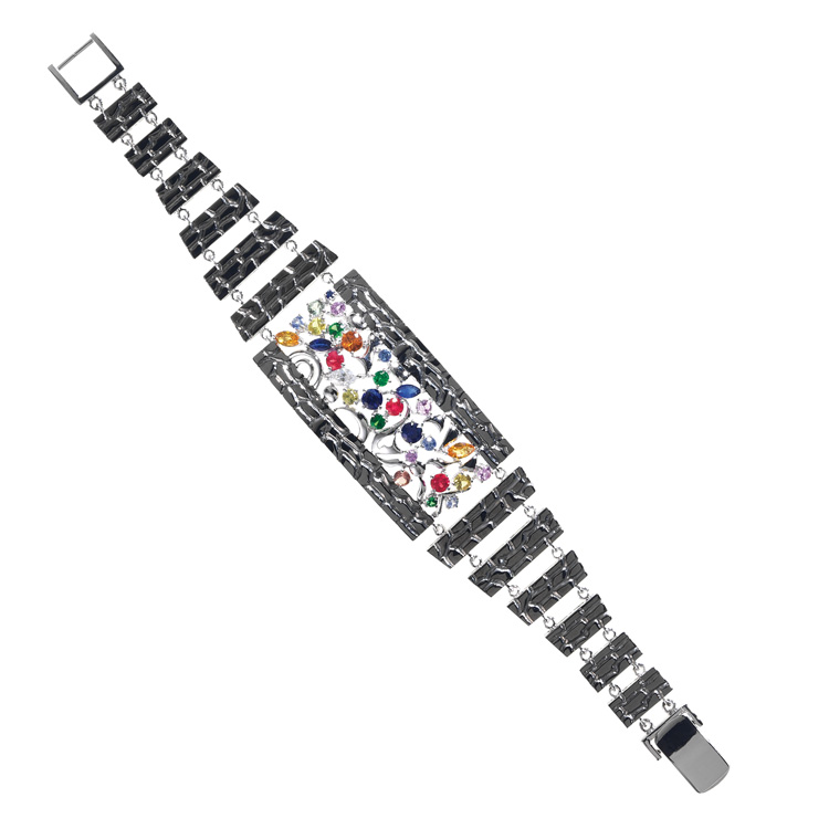 18K gold, corundum, diamonds and tsavorite are masterfully placed on the pendant with matching bracelet. Ruby and sapphire are added to the earring set. This artisan design is contemporary and unforgettable.
