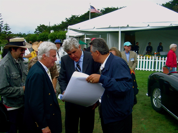 Ken Gross, Jay Leno and Sir Alfred DiMora look over renderings of the Natalia SLS 2 at Pebble Beach Concours d’Elegance. Photograph courtesy of Sir Alfred J. DiMora/DiMora Motorcar.
