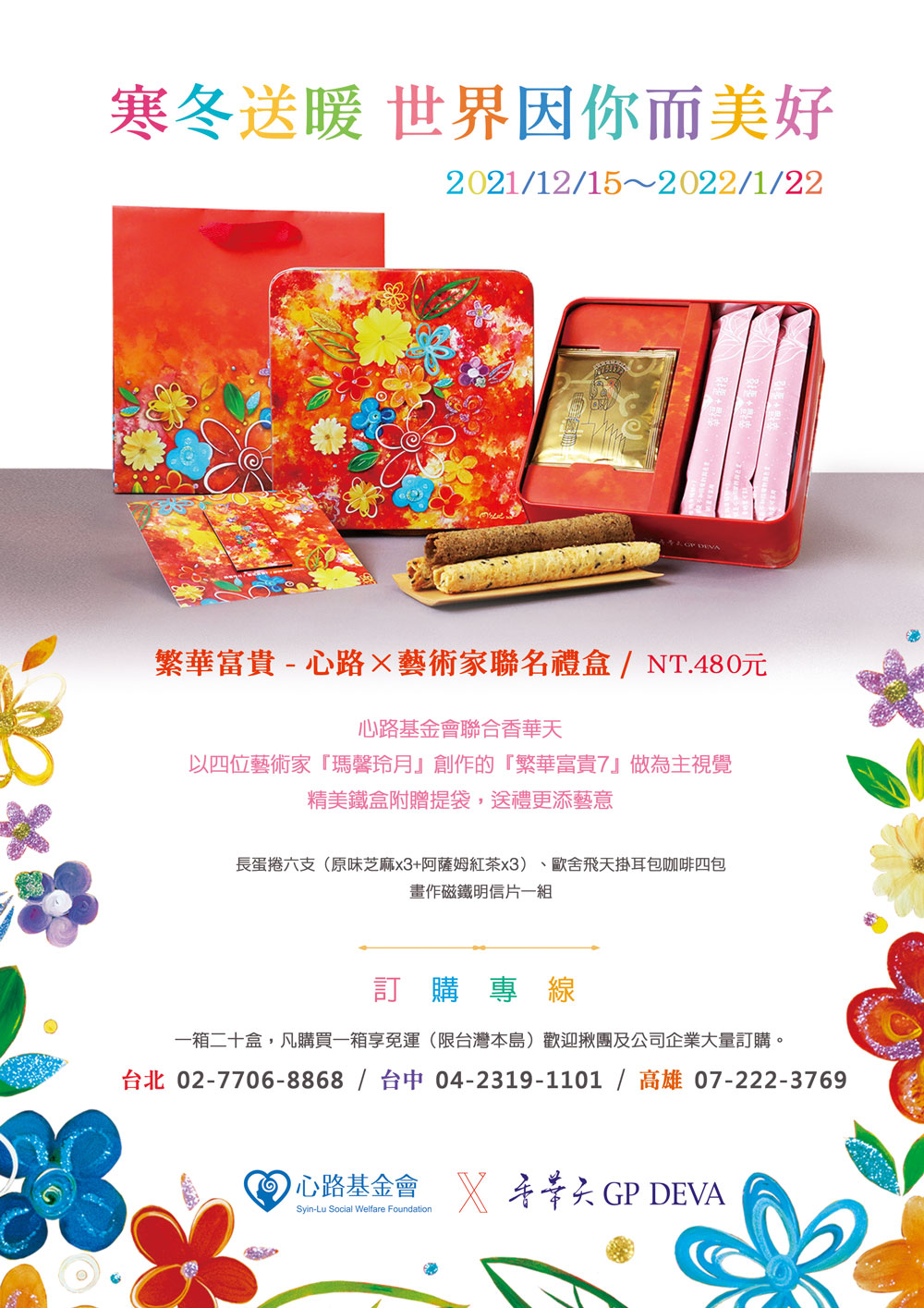 繁華富貴 - 心路×藝術家聯名禮盒(蛋捲款)NT$480 內裝4包歐舍飛天濾掛咖啡包與6支長蛋捲(原味芝麻/阿薩姆紅茶) 藝術團體「瑪馨玲月」的藝術家陳誼欣Luna曾跟著「心路・幸福+工場」的庇護員工學習,體驗製作蛋捲、包裝禮盒,其他成員鄭如玲Ling Ling、王馨薇Singway、張心禹Manihoo除了誇讚蛋捲真的很好吃、不會膩口,也呼籲大家可以貢獻一己之力,愛心認購公益禮盒。 「他們受到幫助後再透過手作餅乾與蛋捲,將樸實幸福轉而回贈給我們,人與人的互動是簡單、真實又可貴的。」 瑪馨玲月MSLL成員-張心禹Manihoo、王馨薇Singway、鄭如玲Ling Ling、陳誼欣Luna,團體名稱是名字的組合。 繁華富貴 - 心路×藝術家聯名禮盒 延續去年風格,今年的繁華富貴禮盒同樣使用鐵盒包裝,主視覺的花朵局部上光打凸,精緻浮雕觸碰起來令禮盒更有溫度,用作送禮不只美觀大方,還具有收藏價值。尤其適合新人選做喜餅,附贈的年節限定畫作磁鐵等於婚禮小物,能讓賓客為您好好收藏珍貴時刻。 令人捨不得丟的餅乾禮盒 / 附畫作磁鐵+藝術家介紹卡 細緻設計,取畫作上花朵葉子線條、局部上光打凸 原畫作系列《繁華富貴》以花朵呈現繁華風貌,樸實無華的筆觸勾勒赤子之心。瑪馨玲月表示藉由此系列想傳達出擁有赤子之心,就能看到真相做出正確的選擇。花朵變身精美禮盒正是傳達心路基金會庇護工場青年們的心意,無論身心如何障礙或重或輕,他們都會努力正向、樂觀,無怨無悔生活下去。 心路基金會:謝謝您,讓青年走出屬於自己的路 民國76年,以來自全台各地100、200元的捐款,一群智能障礙者家長成立了台灣第一個由身心障礙者家長所發起的社福組織--心路文教基金會民國88年更名為財團法人心路社會福利基金會) 心路服務的對象,包括智能障礙、自閉症、唐氏症、腦性麻痺或其他伴隨有智能障礙的多重障礙者,除了結合社工、復健和特教等專業服務,也包括孩子在幼兒時期的早療服務,以及成年後的就業服務。 成立庇護工場走過幾年的光陰,在庇護員工身上我們看不到遺憾,只有對生命的熱情,用最單純的勇氣與態度面對生活。從分不清奶粉和麵粉,到學會手做蛋捲、餅乾、鳳梨酥、添加原料、原料秤重... 每個全心全意的動作,都證明他們能贏得你我的掌聲!您的支持將砌成鼓勵,讓智能障礙者的生活開啟不一樣的夢想。 香華天2021慈善公益・寒冬送暖 「繁華富貴 - 心路×藝術家聯名禮盒(蛋捲款)」購買方式 / 現場購買 / 「香華天・新藝境」台北旗艦店 電話:02-77068868 地址:台北市敦化北路207號1樓&B1 「香華天・新藝境」台中門市 電話:04-23191101 地址:台中市東興路三段167號1樓 「香華天・新藝境」高雄門市 電話:07-2223769 地址:高雄市中正二路91號1樓 / 訂購優惠 / 歡迎公司團體共襄盛舉慈善活動,凡購買禮盒滿5萬95折,10萬9折 / 運費說明 / 如需寄送,消費一箱(20盒)免運費(限台灣)本島 不足箱將須額外支付180元運費,境外、外島、偏遠區域需另報價