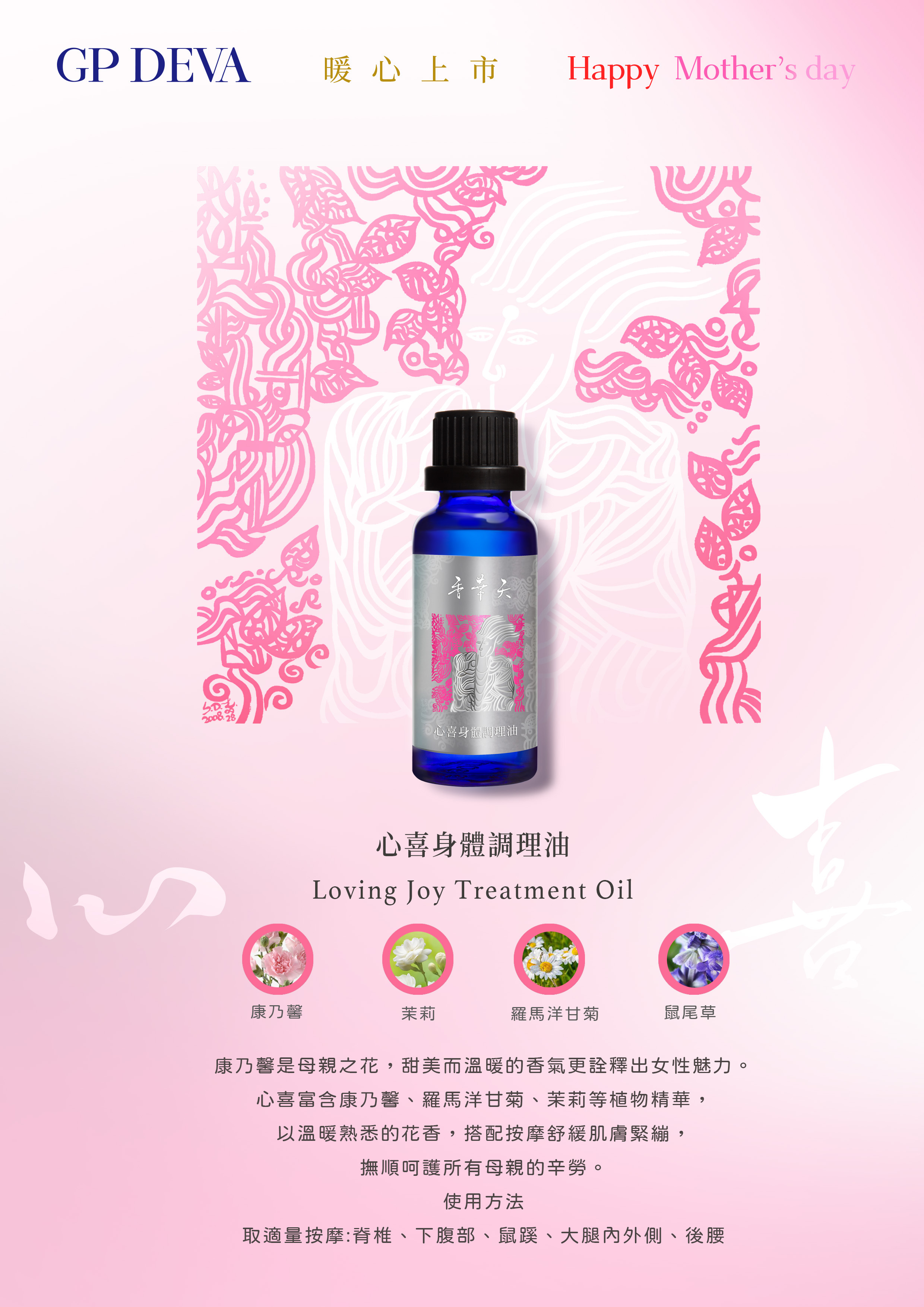 心喜富含康乃馨、羅馬洋甘菊、茉莉等植物精華,